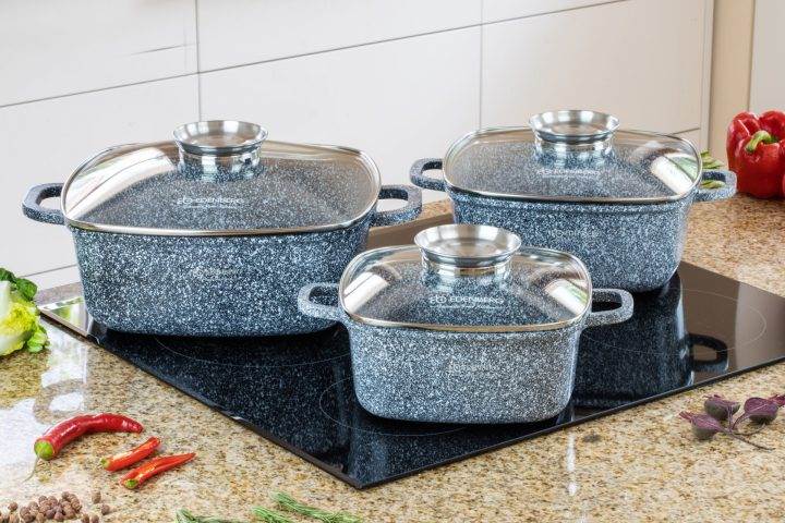 Материал: экструдированный алюминий с керамическо-гранитным покрытием и дополнительным антипригарным покрытием non-stick, без вредных добавок pfoa, высокая устойчивость к царапинам и температурам, крышки изготовлены из закаленного стекла с отверстием для выпуска пара, подходят для всех типов плит, в том числе индукционных, в набор входят 3 кастрюли с крышками диаметром 20см, 24см, 28см.